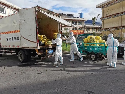 (國(guó)策環(huán)保林芝分公司工作人員清運(yùn)醫(yī)療廢物)