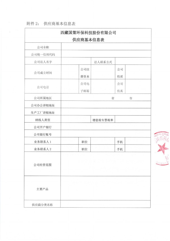 供應(yīng)商將資料整理成冊并每頁蓋章后掃描為PDF文件,發(fā)送至西藏國策環(huán)??萍脊煞萦邢薰静少忇]箱:cg@guoce.com。