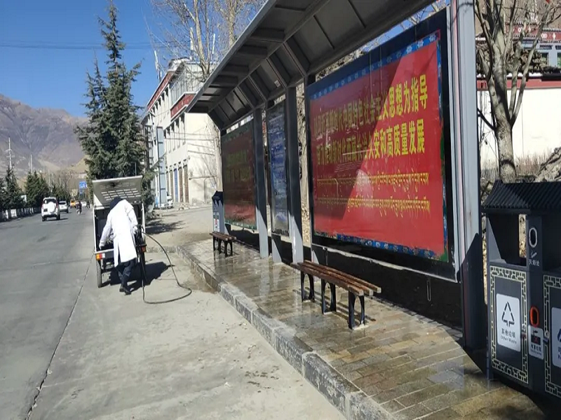 早上八點的山南市城區(qū)道路上空曠安靜,車輛和行人寥寥無幾。國策環(huán)保一線環(huán)衛(wèi)工人正在對所屬轄區(qū)內(nèi)的生活垃圾進行清運,并對所經(jīng)過的重要路段、公交站、垃圾回收點、公廁等噴灑消毒液。