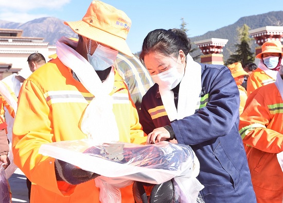 1月7日,為表達(dá)對(duì)國(guó)策一線環(huán)衛(wèi)工人的關(guān)懷和祝福,林芝市慈善總會(huì)在工布公園工布廣場(chǎng)開(kāi)展了“寒冬送溫暖 致敬城市美容師”送冬衣活動(dòng)。活動(dòng)現(xiàn)場(chǎng),市慈善總會(huì)工作人員為50名環(huán)衛(wèi)工人敬獻(xiàn)哈達(dá),并送上慰問(wèn)冬衣。